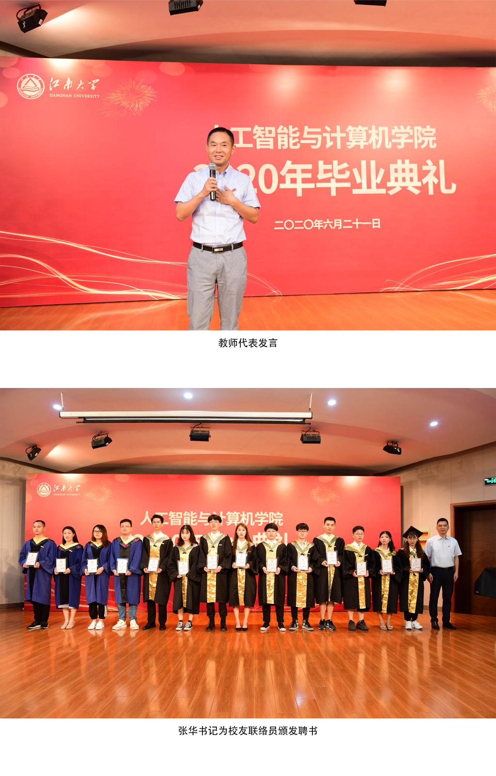 张华书记宣读了校友联络员聘任名单并依次为校友联络员颁发聘书。刘渊院长代表全体教职员工祝贺大家顺利毕业!向辛勤培育毕业生的父母和各位老师致以衷心的感谢!院长以“自信、成长、博爱”三个关键词,寄语全体毕业生要自信自强,用内心的力量,不断挑战自我、超越自我,在这个瞬息万变的信息时代做勇立潮头的开拓者;要在未来生活的纷繁复杂中、在社会的大熔炉中,坚持学习,踏实实践,不断沉淀自我,走向成熟;要用一颗温柔的心去包容世界,感怀前辈们的栉风沐雨,感谢这个催人奋进的时代,感恩给予你帮助的所有人,感恩母校,更要感恩我们伟大的祖国。典礼结束后,刘渊院长为每一位毕业生颁发毕业证书并合影留念。