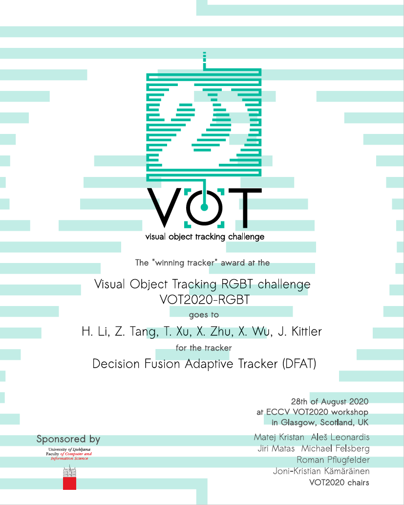 近年来吴小俊教授团队在国际顶尖的视觉目标跟踪竞赛中屡获佳绩,继在VOT2018公开数据集获得了第一名的成绩之后(见国家自然基金委报道www.nsfc.gov.cn/publish/portal0/xx/08/info74984.htm),团队成员于今年国际计算机视觉与模式识别会议(Conference on Computer Vision and Pattern Recognition,CVPR2020)上举办的反无人机Anti-UAV跟踪竞赛中也斩获了第一名;今年在ECCV2020举办的VOT的RGB-T竞赛中再次夺冠。该团队通过长期的国际合作取得了显著的成效。