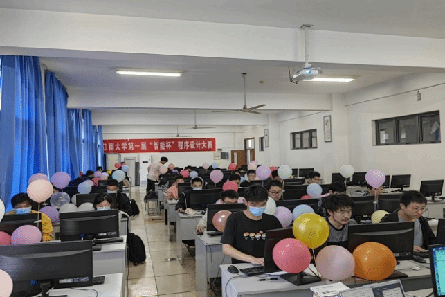 此次大赛于10月11日-14日发布大赛通知且开放报名通道,吸引了全校来自不同学院近300名同学报名参赛。大赛共分三个阶段:网络预选赛、热身赛及现场赛。经过网络预选赛后,有44名同学进入到最终的热身赛及现场赛。现场赛中每个题目对应一种颜色的气球,成功解答该题目的队伍会得到对应颜色气球。比赛现场竞争激烈,同学们争分夺秒,气球争相升起,经过长达5个小时的角逐,国产自拍