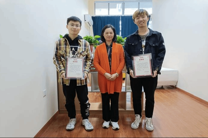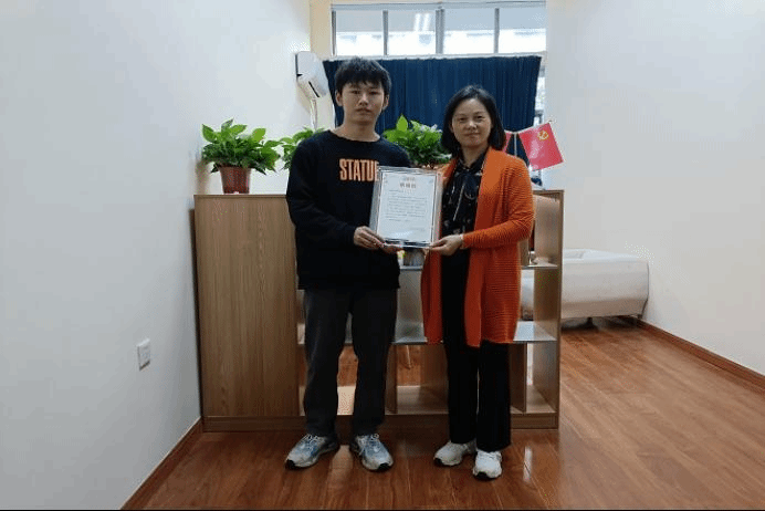 陈祎为王钒宇、丁镛焜同学颁发感谢信