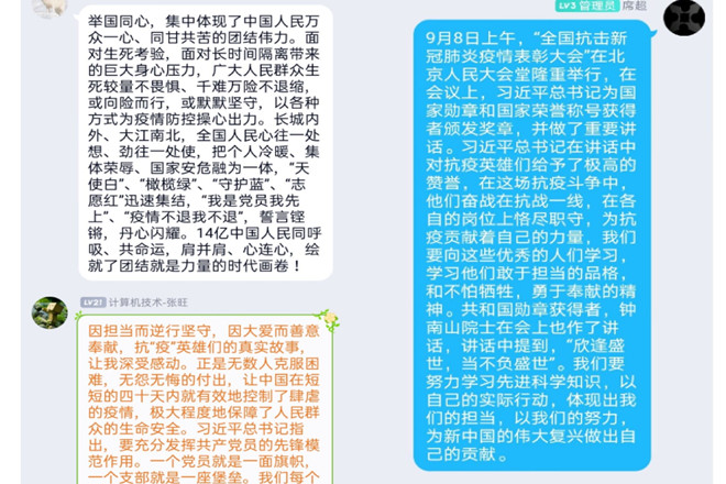弘扬抗疫精神,牢记初心使命。9月8日上午,全国抗击新冠肺炎疫情表彰大会在北京人民大会堂隆重举行。中共中央总书记、国家主席、中央军委主席习近平向国家勋章和国家荣誉称号获得者颁授勋章奖章并发表重要讲话。同时,大会对全国抗击新冠肺炎疫情先进个人、先进集体,全国优秀共产党员、全国先进基层党组织进行表彰。国产自拍师生党员踊跃观看了大会实况直播,反响热烈,纷纷发表了自己的感想和体悟。