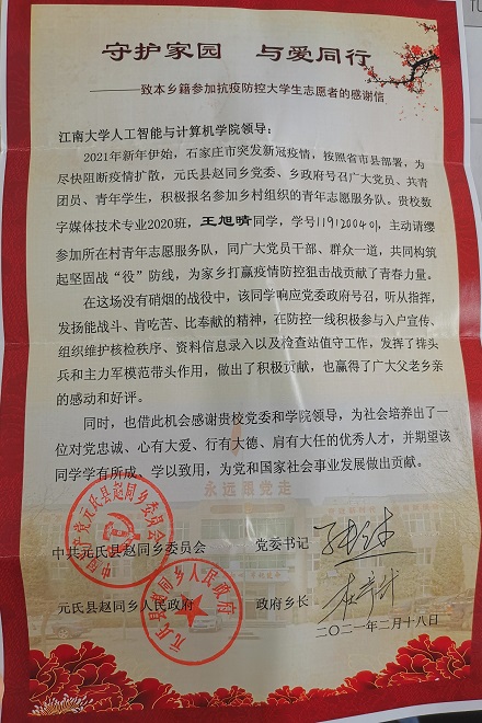 近日,国产自拍收到中共元氏县赵同乡委员会和元氏县赵同乡人民政府发来的感谢信,感谢数字媒体技术2004班学生王旭晴主动请缨参加村青年志愿服务队,为家乡打赢疫情防控阻击战贡献了青春力量。