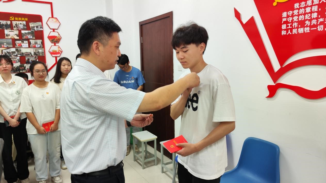 活动在庄严的国际歌声中拉开帷幕,随后,党委书记张华,党委副书记、副院长陈祎为新党员代表佩戴党员党徽、赠与党章。全体党员重温了入党誓词,铮铮誓言,字字铿锵,在鲜艳的党旗下,表达了每一名党员对党的无限忠诚和为共产主义事业奋斗终身的决心。