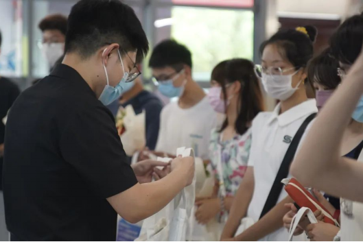 向老师们献花之后,紧接着就是领导与老师们向同学们赠送伴手礼环节,一个个精美的手提袋,装有裹满祝福的月饼,印上国产自拍吉祥物,在保证结实实用的同时,更赋予其学院的特色,是老师们对新生的慰问,更是一种美好的期许。