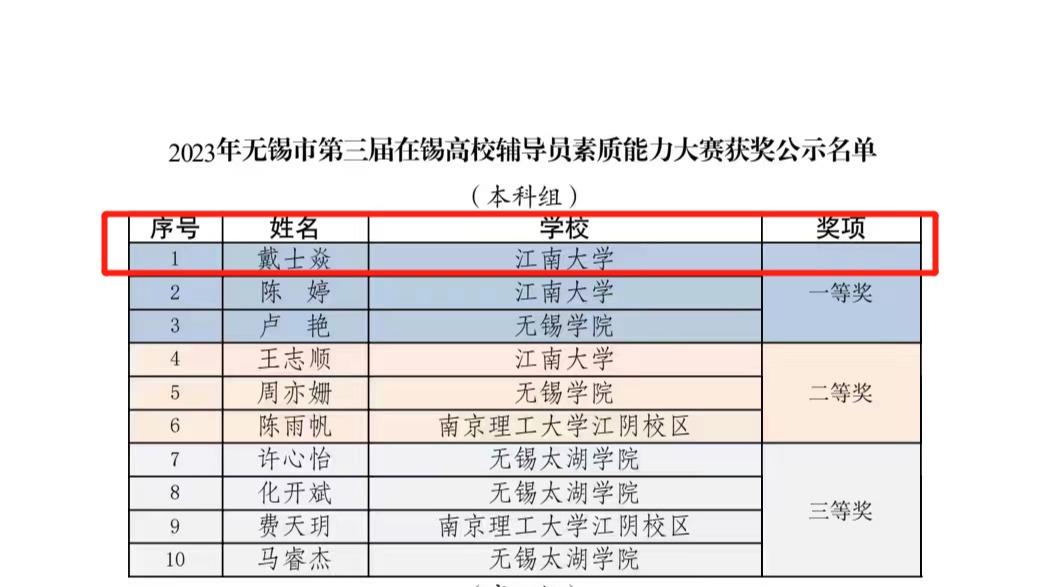 5月13日,由无锡市教育局主办,无锡市职业院校思想政治教育联盟、无锡城市职业技术学院、无锡市职业技术教育学会德育工作委员会承办的无锡市第三届在锡高校辅导员素质能力大赛在中国企业管理无锡培训中心成功举办。来自全市16所高校的32位辅导员同台竞技、各展风采,大赛对选手的理论水平、专业素养以及解决实际问题的能力进行了多角度的考察。经过激烈角逐,我院辅导员戴士焱荣获本科组一等奖,充分展示了我院辅导员良好职业素养和精神风貌。