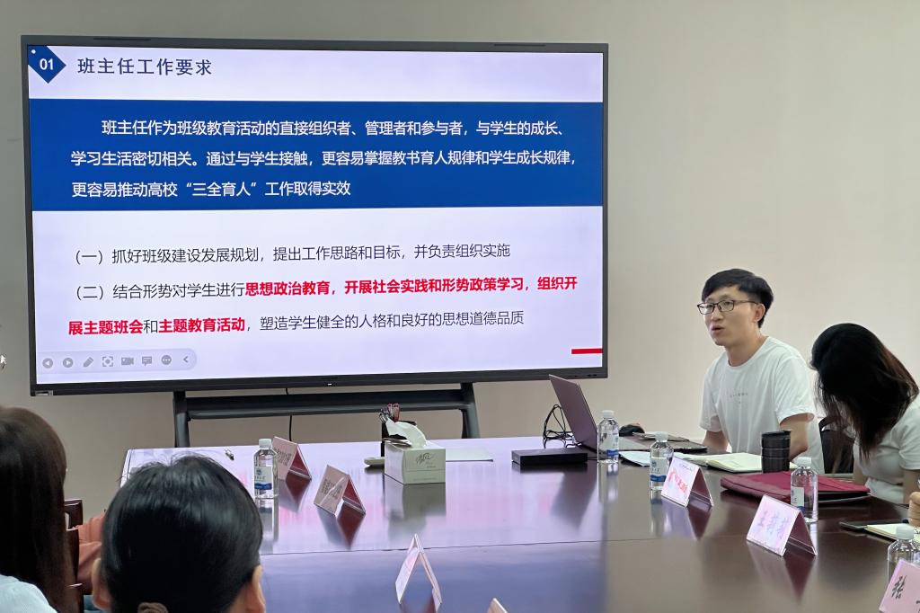 会上,新生辅导员李猛基于“三全育人”理念,从学生思想政治教育、班级建设和日常管理、学风建设等方面介绍班主任工作的具体职责和要求,详细解读国产自拍
