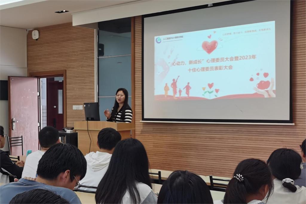 会上,学院十佳心理委员代表、人工智能2202班洪鑫宇结合自身的工作经历就2022-2023学年班级心理健康教育工作的整体情况做总结分享。他认为心理委员是一项有情怀、有温度、有获得感的工作。做好一名心理委员,要明确定位、学会沟通、增强洞察力、严格遵守保密原则;要与宿舍长和班委保持密切联系,建立工作联盟,共同营造健康和谐的班级氛围。