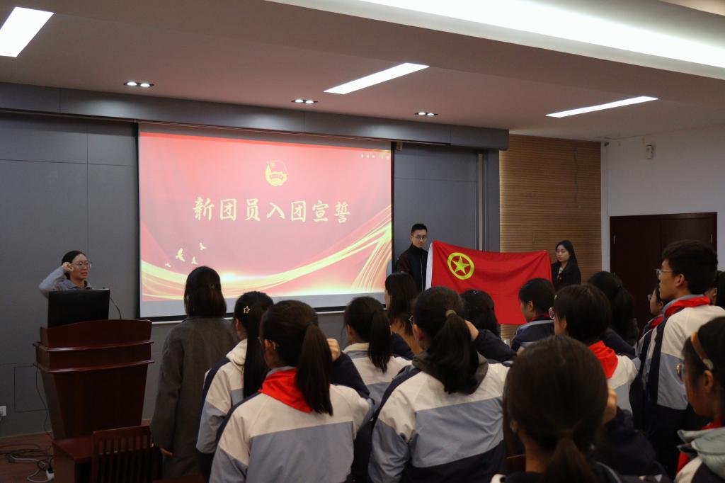 在鲜艳的团旗前,全体新团员庄严宣誓。铿锵有力的誓言在报告厅回荡,诠释着新团员光荣的时代担当;紧握的右拳,表明了团员们坚定的信念和决心。