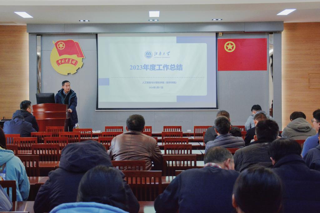 学院副院长(主持工作)方伟作学院2023年工作报告。他代表学院向全体教职工一年来的辛勤付出表示敬意和感谢,为全院师生员工送上新年祝福。随后,从科研工作、人才培养、教育教学、学生工作、国际交流、社会资源等方面总结梳理了学院第八轮任期目标年度完成情况,阐述了学院过去一年取得的显著业绩与突出成果,并就学院师资队伍建设、人才培养、学科融合等重点工作的推进情况做了详细说明。他指出,2023年大事多、喜事多,学院事业发展取得了新成效,但也要正视学院发展过程中面临的机遇和挑战,希望全体教职工团结一心、凝聚共识、鼓足干劲,为学院发展贡献新的更大力量。最后,就学院2023年度绩效考核工作做了详细解读。