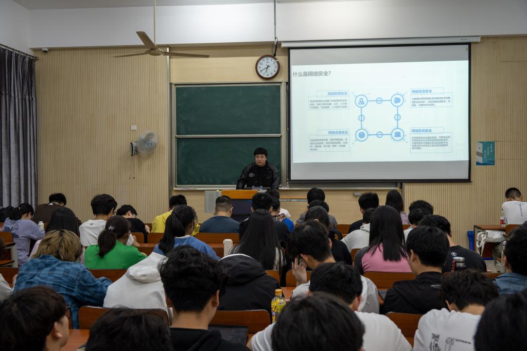 张令鑫围绕网络安全法律与伦理、技术与应用及其发展趋势做了重点报告。他指出,网络空间已经发展成为继陆、海、空、天之后的“第五空间”,是影响国家安全、社会稳定、经济发展和文化传播的核心、关键和基础,没有网络安全,就没有国家安全。他强调,日常生活中网络问题层出不穷,广大同学需树立网络安全意识、规范网络使用行为,注重个人信息隐私保护、手机软件使用安全。同时,生成式人工智能在网络安全领域应用效果初显,同学们应立足自身专业发展,不断提高自己的专业素养,为成为一名网络安全人才做好充分准备。