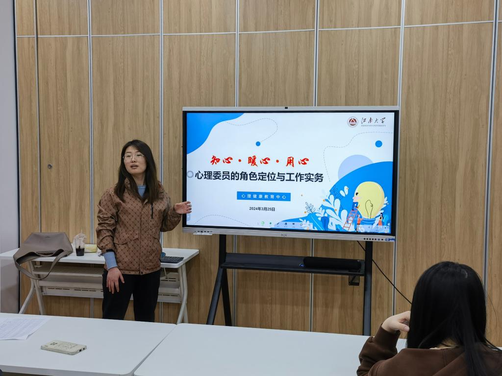 会上,杨玉莹从心理委员的角色定位、工作职责、工作技能与策略以及心理委员的自我关怀四个方面做题为《心理委员的角色定位与工作实务》的专题培训。她主要围绕与人沟通的艺术、哪些学生需要密切关注、危险预警信号、正确认识心理咨询等内容,结合日常工作中生动具体的实际案例,详细介绍了心理工作的基本技巧和方法。她希望全体心理委员一要知心陪伴,成为班级同学的信赖者;二要暖心相伴,成为阳光心理的传播者;三要悉心帮助,成为健康心灵的守护者。