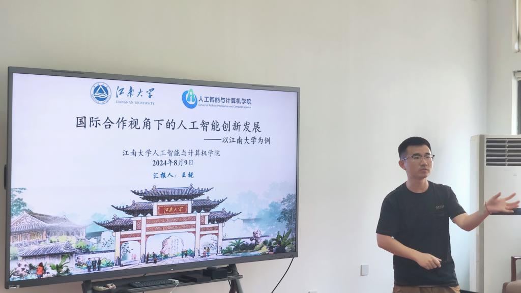 王锐对实践团师生的到来表示欢迎,并作题为《国际合作视角下的人工智能创新发展》的讲座。他以国产自拍