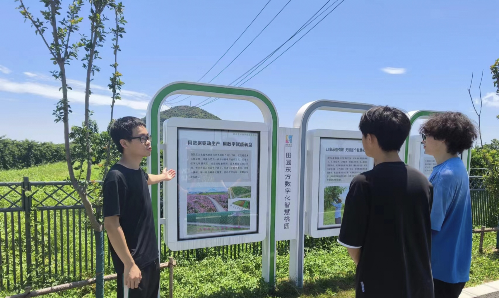 阳山水蜜桃现代科技馆,是本次实践的最后一站。这里不仅展示了水蜜桃产业从种植到销售的全链条智能化解决方案,还通过光影、色彩、造型以及一系列人机交互项目等多种形式,将水蜜桃的生长过程、营养价值以及全自动技术等内容以生动有趣的方式呈现出来,让参观者亲身体验到科技赋能农业发展和乡村振兴的重要意义。