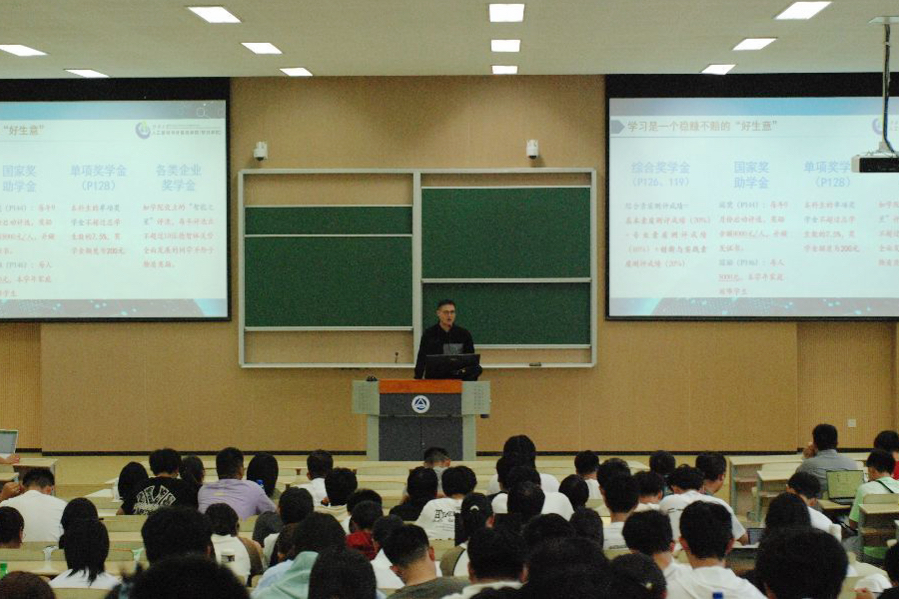 本科生综合奖学金评审办法》等文件对综合素质测评、学生奖学金、各类学生荣誉的评定作出详细讲解。最后,他结合学校近两年处分案例,对学生违纪处分规定进行解读,勉励新生要“守底线、扬高线”,争做遵纪守法、全面发展的智能学子。